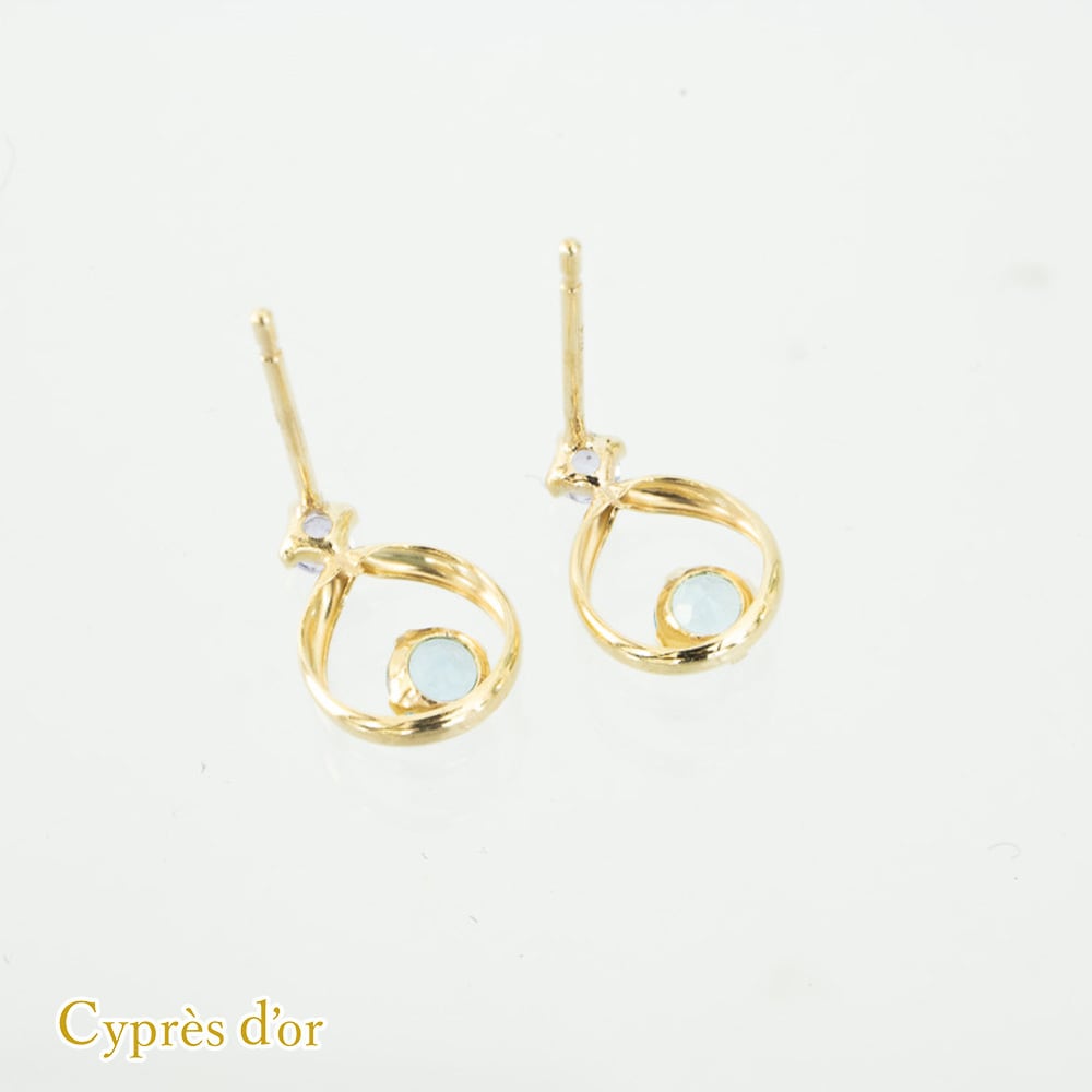 透明感あふれるブルートパーズと、神秘的な青紫色のタンザナイトをあしらったK10ピアス。