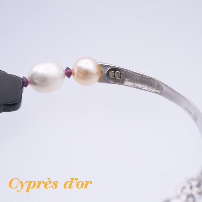 淡水真珠の間にはガーネットのビーズを通してお作りしております。