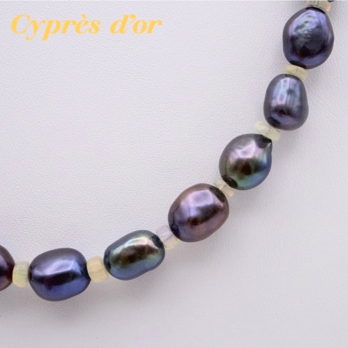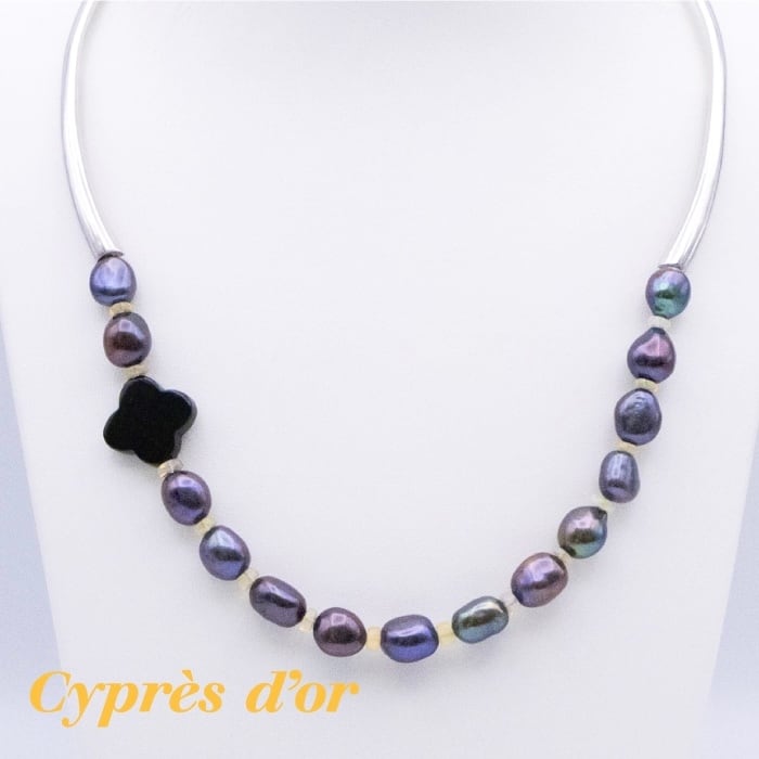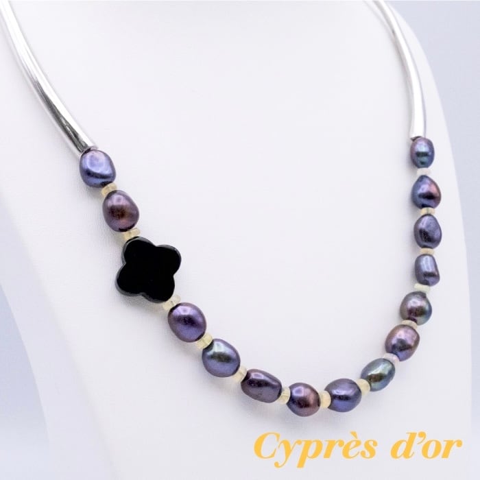 黒真珠(淡水)とオニキス、オパールを組み合わせたシルバーネックレスです。